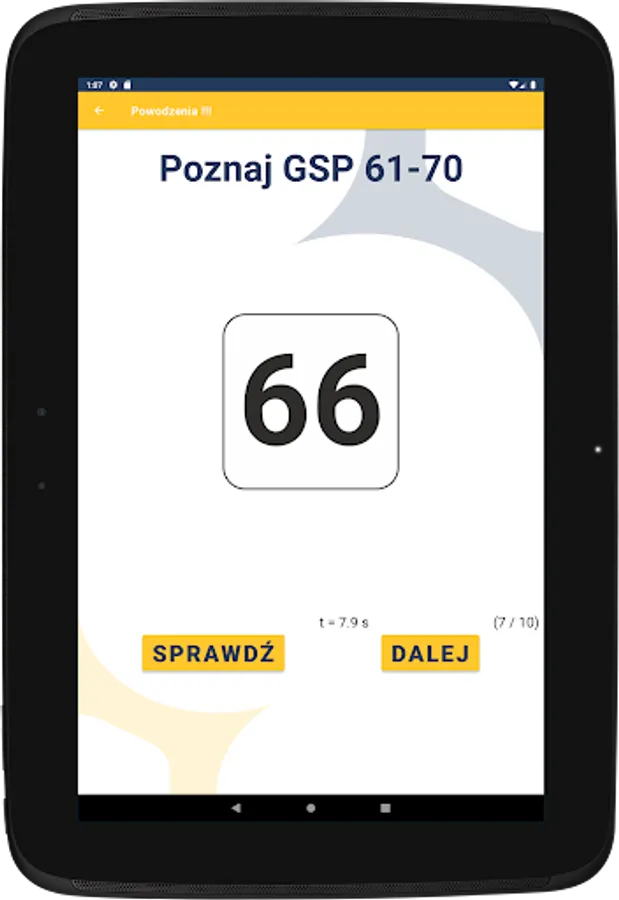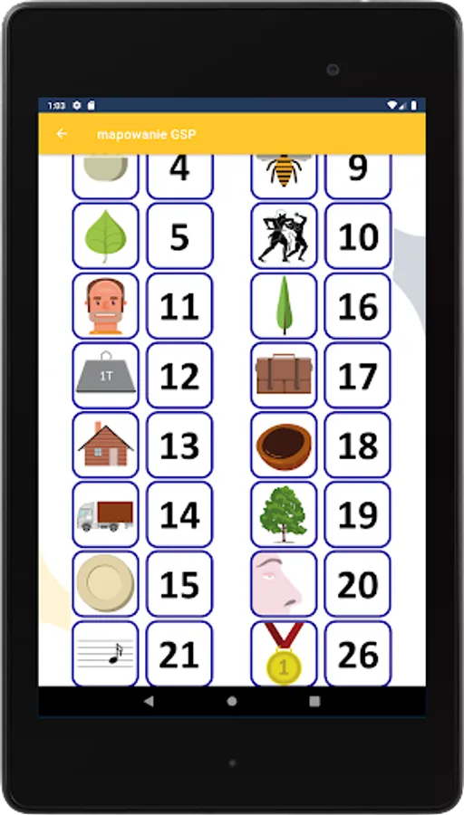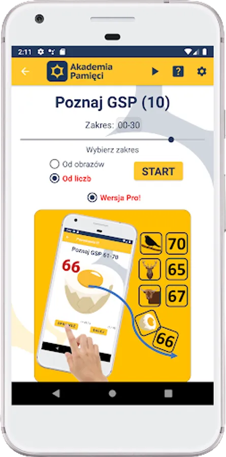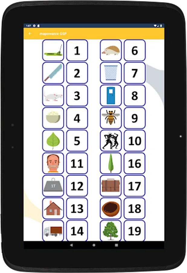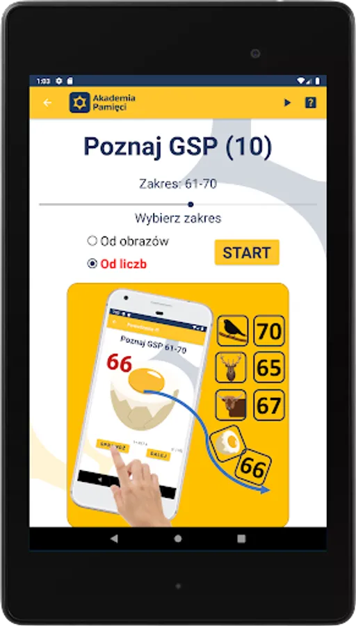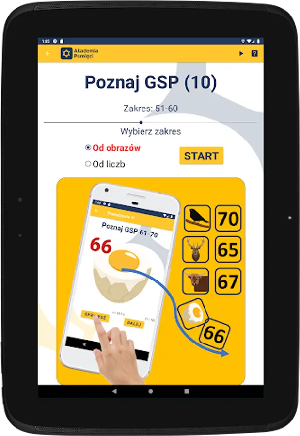 First, choose the range you want to master. Ranges are the next 10 numbers and the corresponding images (tabs). Guesswork begins when you press START or the PLAY button at the top. The images in the selected range are displayed in random order. Your role is to tell which number the displayed bookmark is associated with. If you do not know or are not sure, you can display a hint (CHECK button). A timer will appear at the bottom of the screen and will tell you which bookmark you are guessing and how many total bookmarks there are for this round. After going through all the tabs from the selected range (10 pcs.), Time stops and you can evaluate your results. You can do this exercise in both directions: