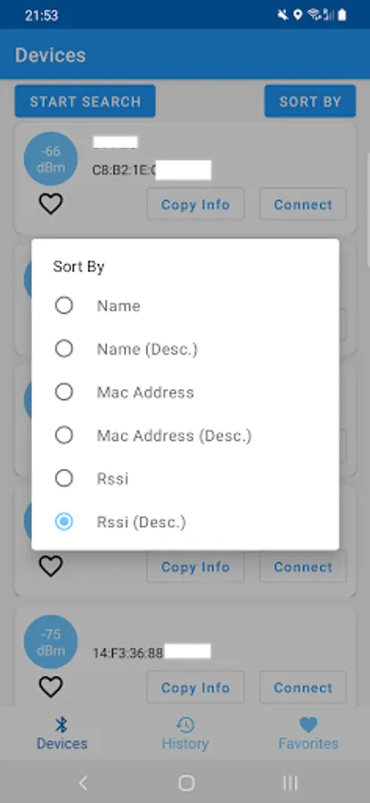 • Filter and sort the devices by Name, Mac Address or RSI.