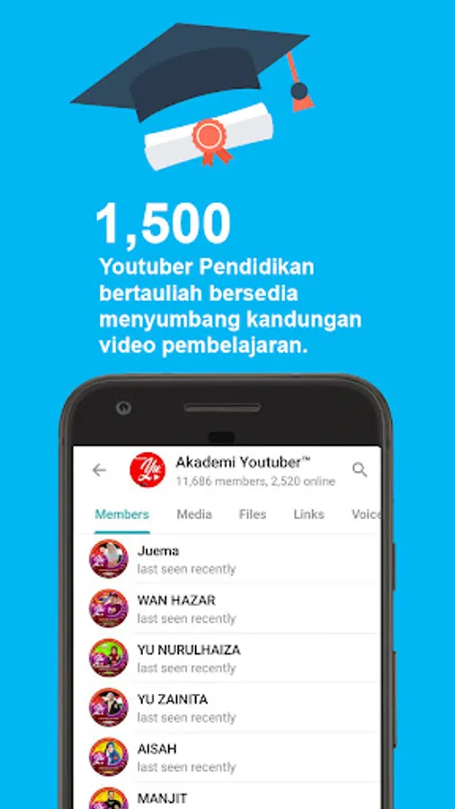 Akademi Youtuber - Hab pembelajaran khas norma baharu di Malaysia menawarkan lebih 20,000 video PdPc yang dihasilkan oleh lebih 1,000 sukarelawan AYU. Selain daripada itu, Tuisyen Percuma secara langsung juga disediakan dan telah mencapai lebih 3,000 jam bersiaran sehingga kini. Lebih 50 segmen khas turut tersedia untuk meningkatkan ilmu pengetahuan mengenai pelbagai bidang kemahiran guru-guru di Malaysia. Aplikasi ini dibina khas untuk memudahkan semua mencari bahan pendidikan berkualiti tinggi dengan lebih tersusun.