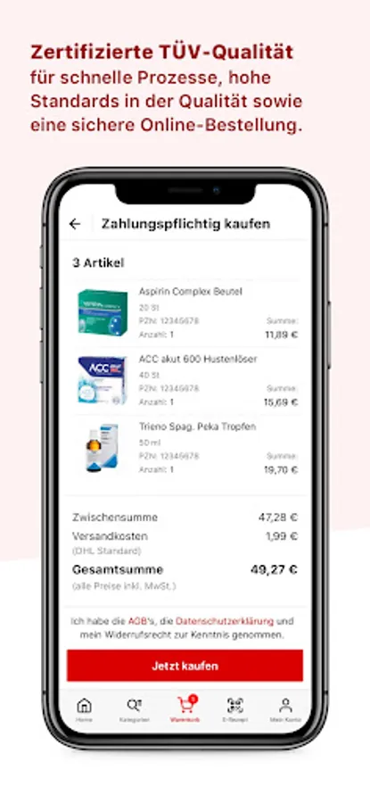 "Pharmacy" enables you to comfortabely and inexpensively order medicaments and save up to 50% RRP on nonprescription medicaments. Through a simple menu you can do this in a few steps - from comfortable searching with lots of productinformations and package information sheets to purchasing. Free shipping to every delivery adress in germany (for standard delivery). Safe and fast.