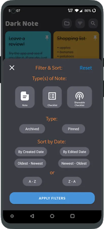 - You can filter by note, checklist, or shareable checklist with a combination of other factors like archived or pinned, and can even sort it by created/edited date or alphabetically.