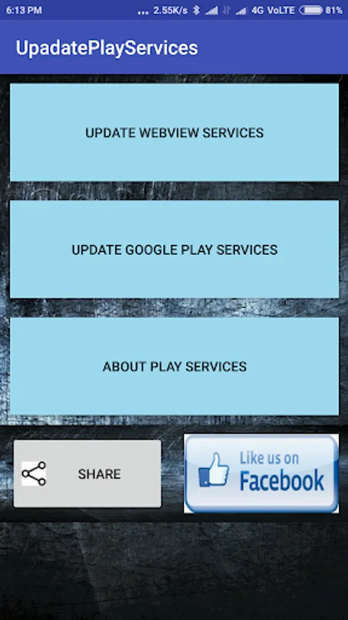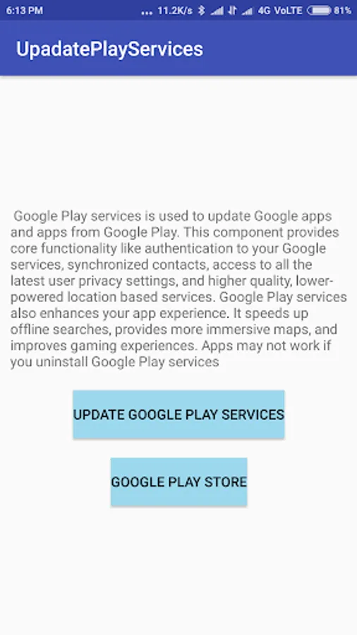 This app check this status of google play services. Shows last update data and current update and it also provide usefull links to the play store.