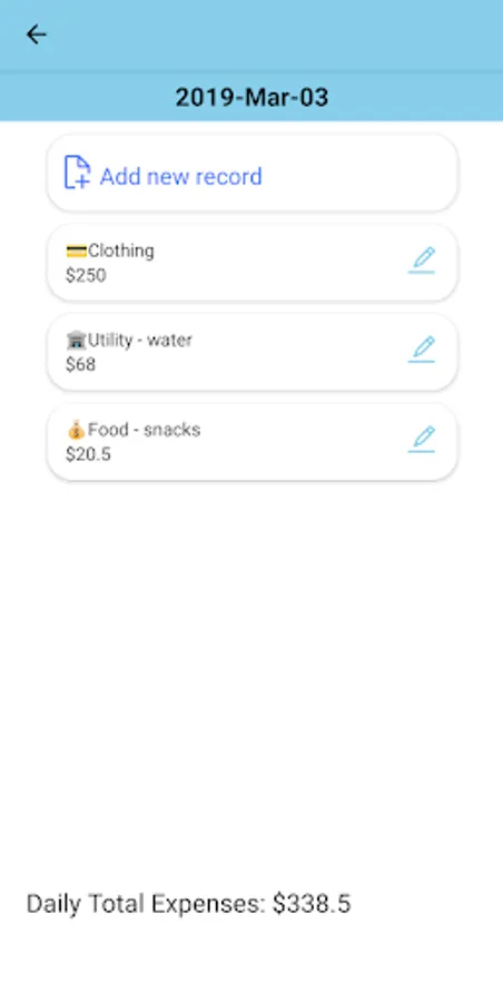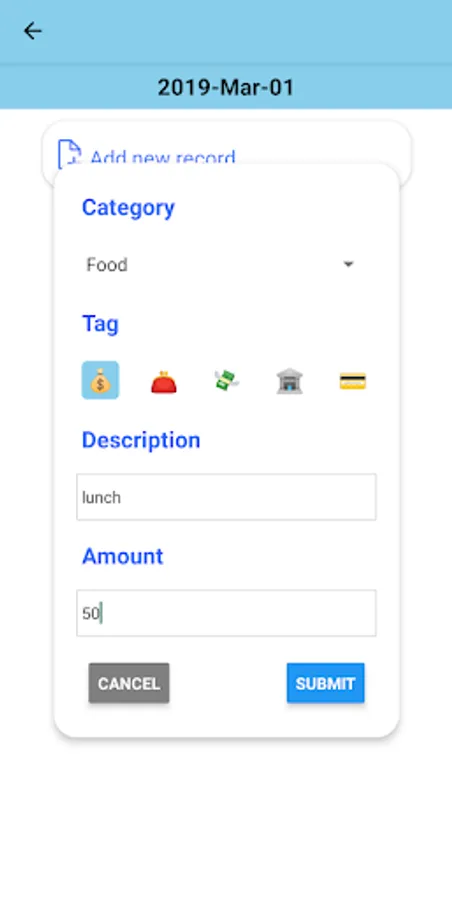 Tap on a date on the calendar, input the amount, optionally select a category, a tag, and/or fill in a description, then it's done.