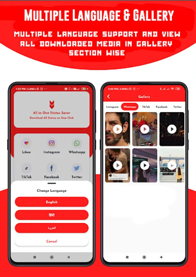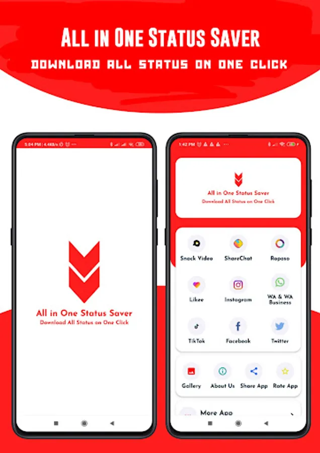 All In One Status Saver is an Android All Social Media Video and Image Downloader App. You can Save Facebook, Insta, Whatsapp Status and TikTok, MxTakaTak, Moj, Josh, Chingari, Mitron, Sharechat, SnackVideo, Roposo, Likee, Whatsapp, WA Business, Twitter, and Instagram Videos and Images, Reel with All In One Status Saver without watermark. You can easily share them from the App. Many More Features are Available in the App, Download the App and see all the features