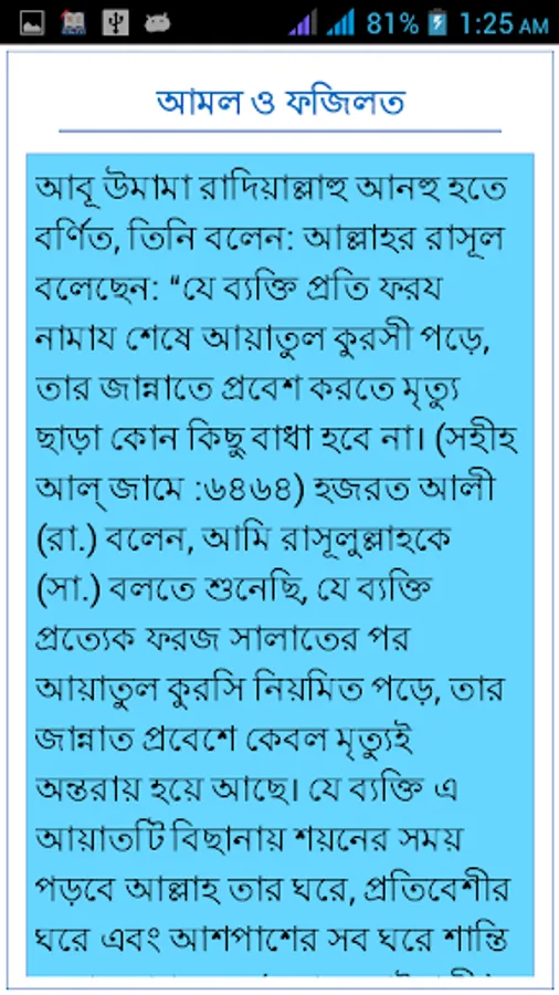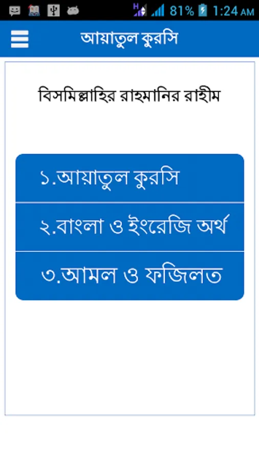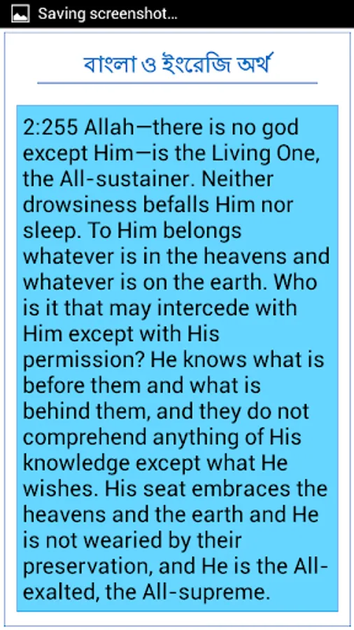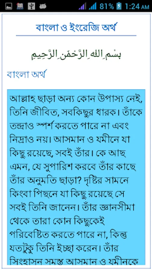 Ayatul kursi (আয়াতুল কুরসি) with Bengali or Bangla and English meaning. you can learn Ayatul kursi by this app.