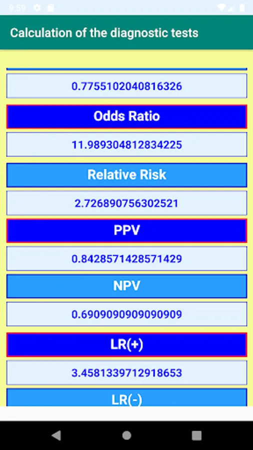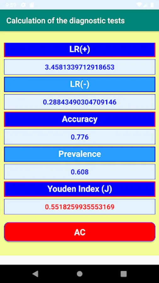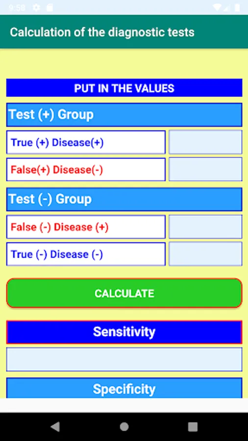 This application that is prepared especially for medical doctors calculates sensitivity, specificity, Odds Ratio (OR), Relative Risk (RR), Positive Predictive Value (PPV). Negative Prdictive Value (NPV), Likelihood Ratio (LR), Accuracy, Prevalence, and Youden Index (J) to evaluate performance of diagnostic test.
