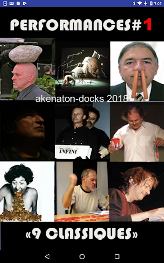 For a long time the DOC(K)S Review, dedicated to experimental poetry, presents on DVDs performances by artists and poets present on the international scene. This application and those of the same kind that will follow will introduce them to phones and tablets. Each performance is accompanied by a critical text and multiple information about its author (s). For this first delivery we have selected 9 performers who can be considered as "classics" by the longevity of their career and by their quality or rigor: we will measure how performance lends itself to variations in style, even if, as an introductory text points out, any show or action is not likely to be regarded as a performance in the full sense of the term. From a technical point of view performance videos can be viewed with or without a connection.
