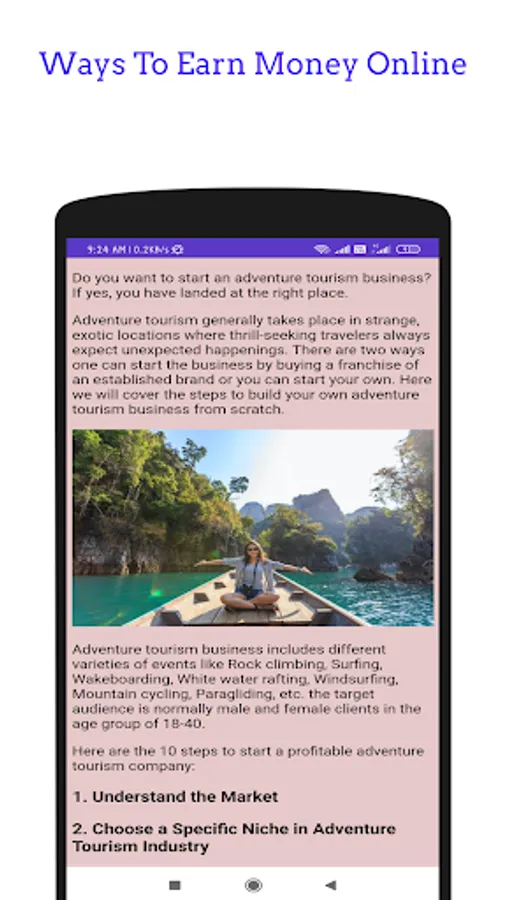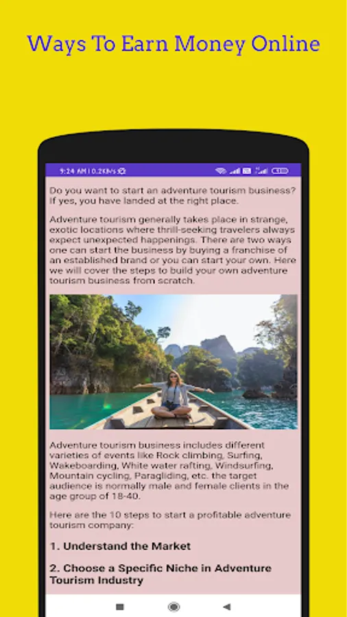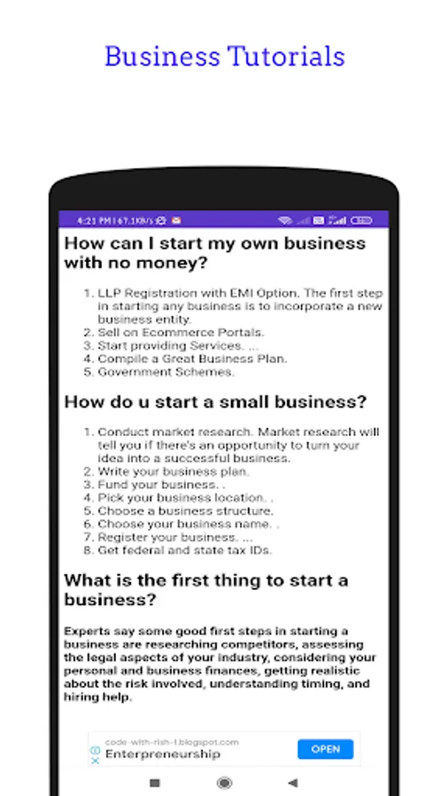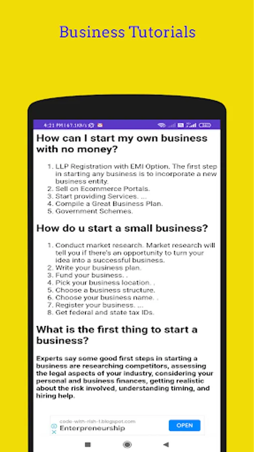 Other things you can find in this app is how to develop a business plan for startups, business opportunities that will help you get ideas, precise advice on how to start a business, ideas for creating a company, profitable small businesses, ideas for entrepreneurship, set up businesses with little money, easy and profitable online businesses and much more.