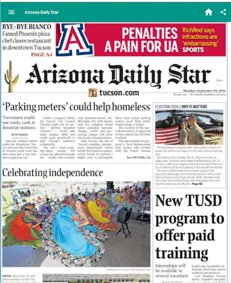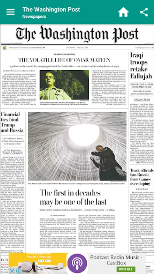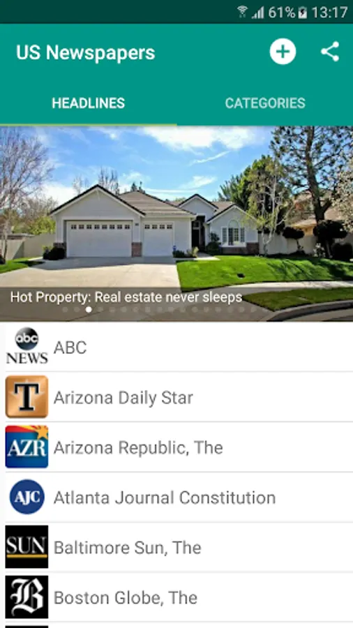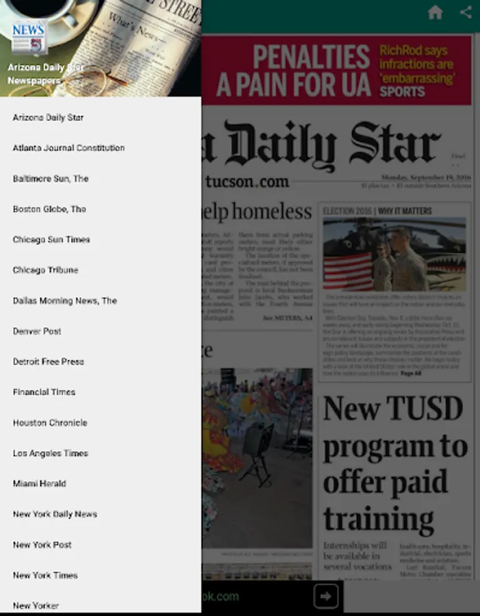 Read newspapers from the US! National and regional newspapers. You can find news from ABC, Arizona Daily Star, Atlanta Journal-Constitution, Baltimore Sun, BusinessWeek, CBS News, Chicago Tribune, CNN, Daily News, Denver Post, Detroit Free Press, ESPN, Financial Times, Fox News, Fox Sports, Houston Chronicle, Los Angeles Times, San Jose Mercury News, Miami Herald, , Newsday, New Yorker, New York Post, , New York Daily News, Orlando Sentinel, Pittsburgh Post-Gazette, San Diego Union-Tribune, San Francisco Chronicle, Seattle Times, Star Tribune, Tampa Bay Arizona Republic; The Boston Globe; The, Dallas Morning News; The, Huffington Post; The, Oregonian; The, Philadelphia Inquirer; The, Plain Dealer; The, Star-Ledger; The, Washington Post; The, Wichita Eagle; USA Today, Wall Street Journal,