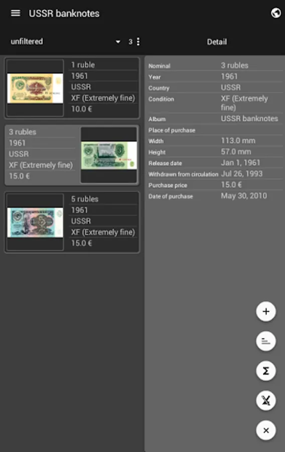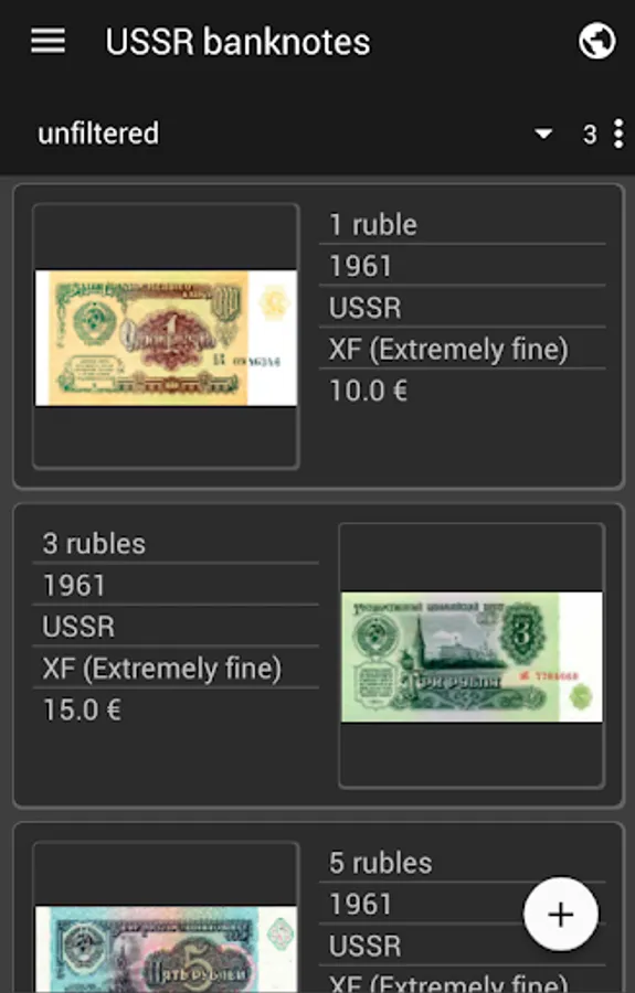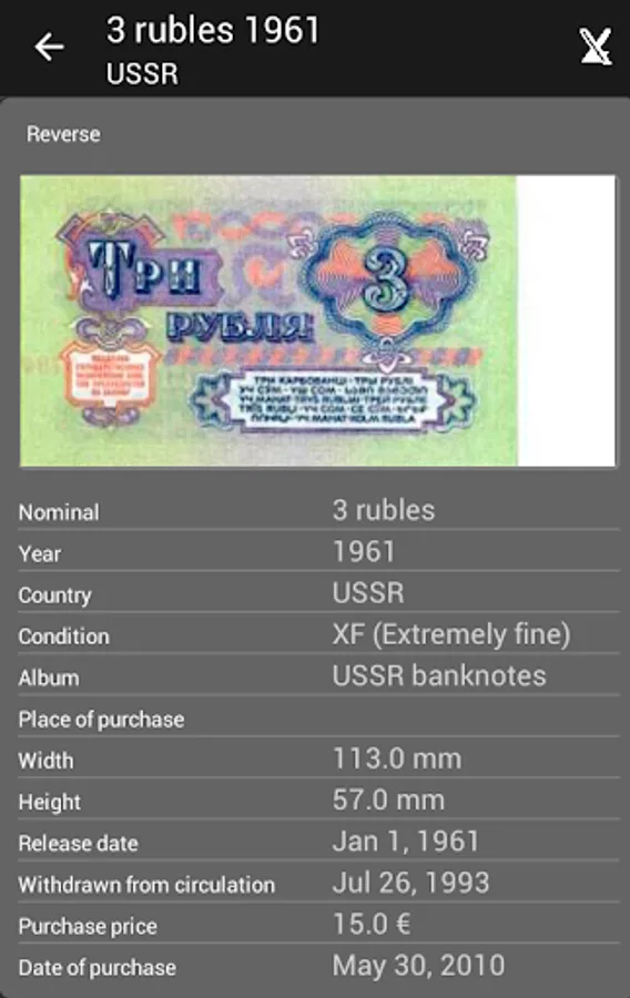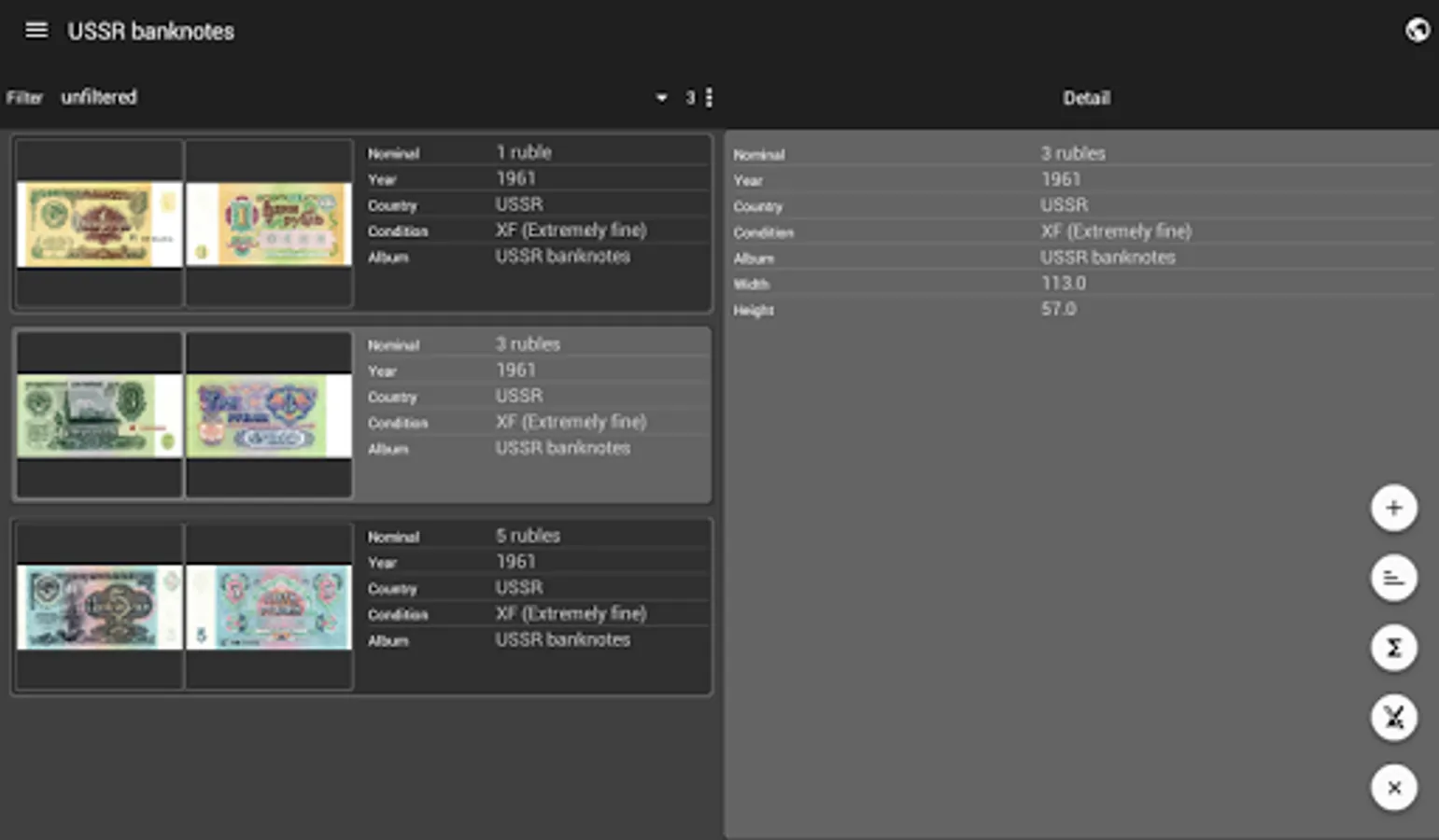 The application is not a directory and intended for cataloging of your own collection of banknotes. It has an intuitive interface, ample opportunities for sorting and searching, ability to manually adjust the handbooks to your needs. Also you can use this app for collection of stamps.