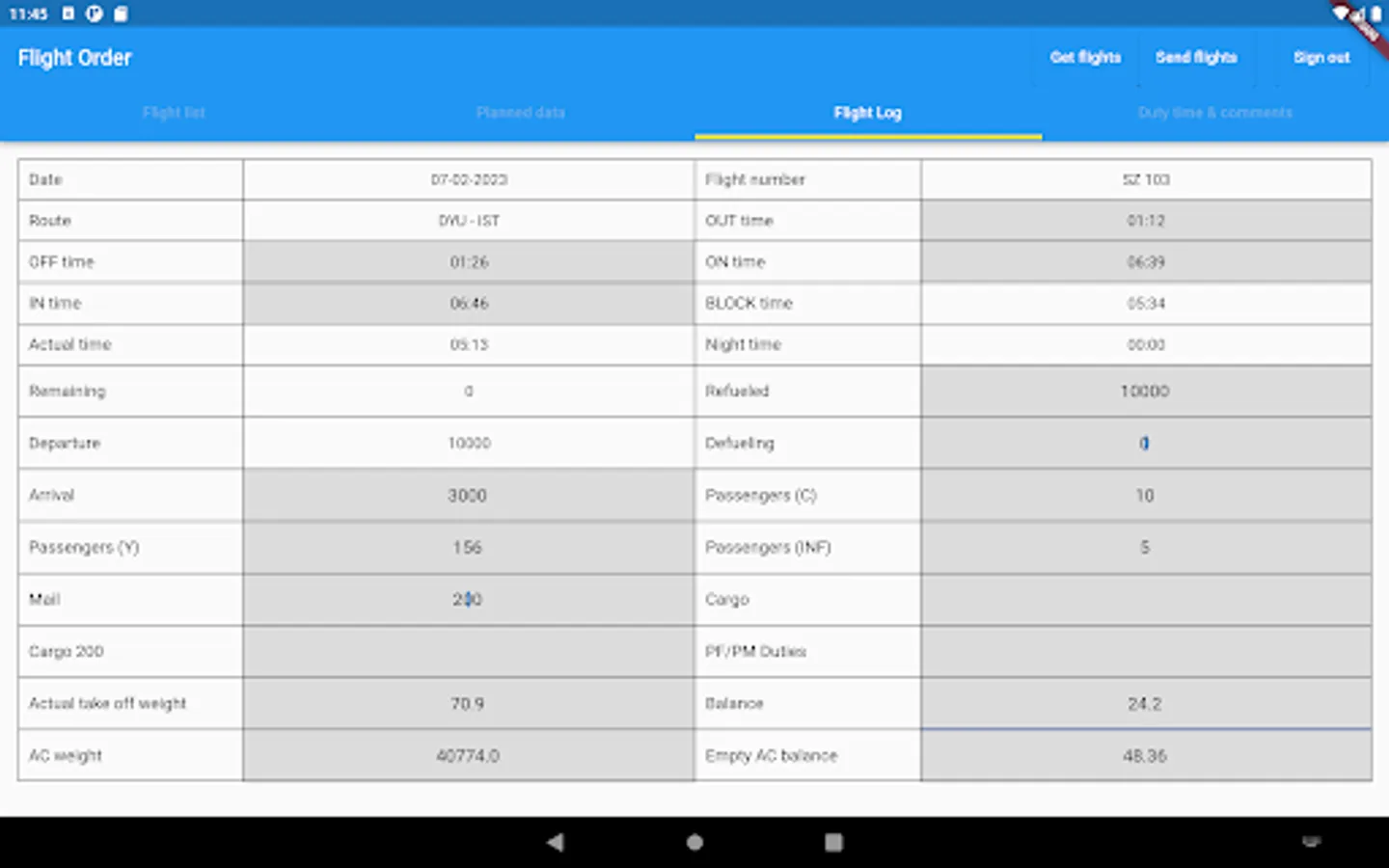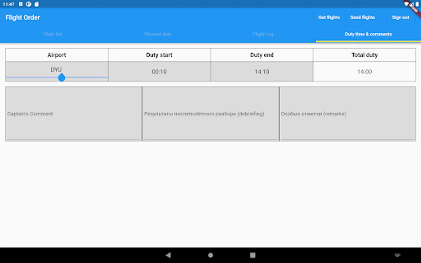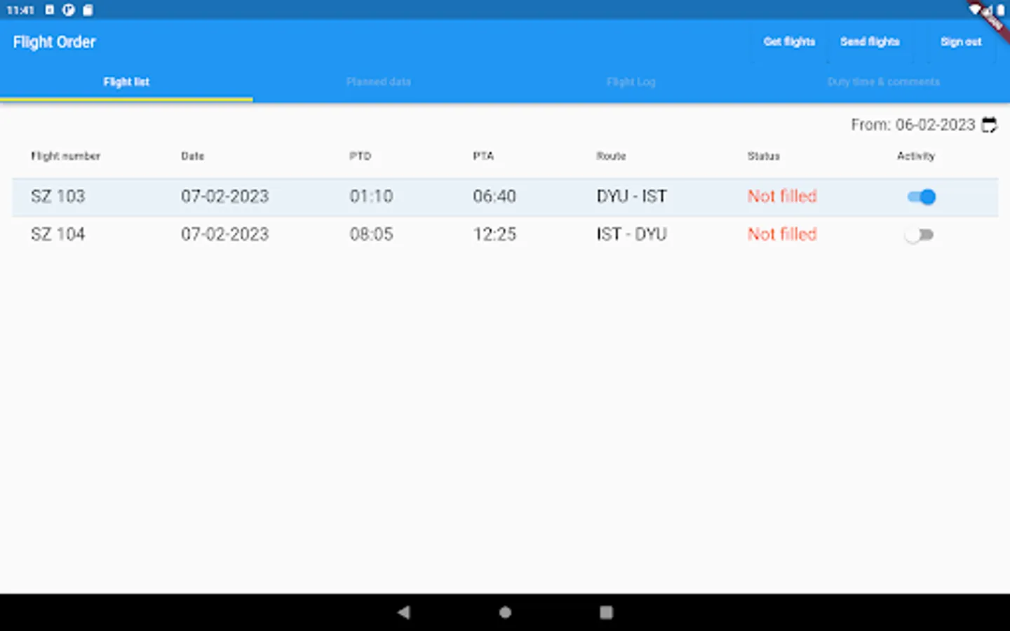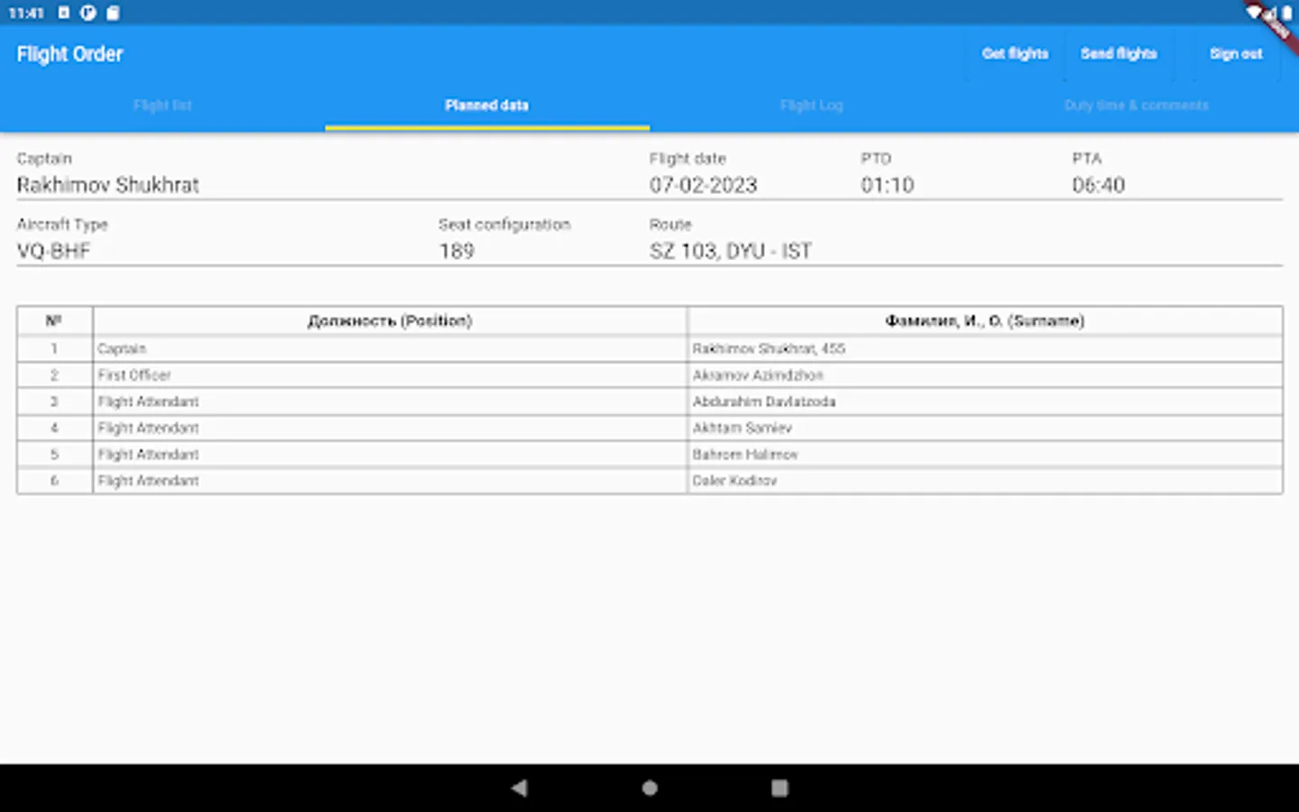 The application is intended for pilots of Somon Air. Using the application, pilots can view the flights scheduled for them, fill in the necessary information about the flights.