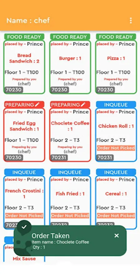 3. Chef User - Once order is placed Chef will have options to pick the order and start working on the order.