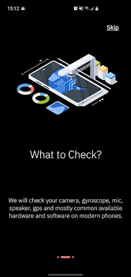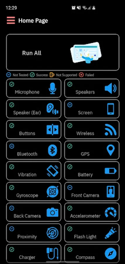 This app tests your device hardware/software with simple tests like accelerometer, gyroscope, nfc, bluetooth, wireless, biometric, humidty, touch screen, buttons and much more.