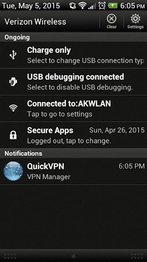 QuickVPN allows you to access your device's VPN connections and settings via an easy-to-use icon in your notification bar.