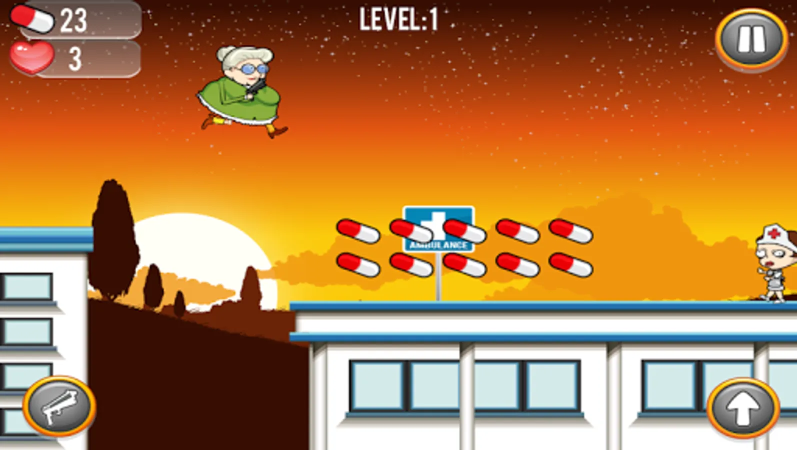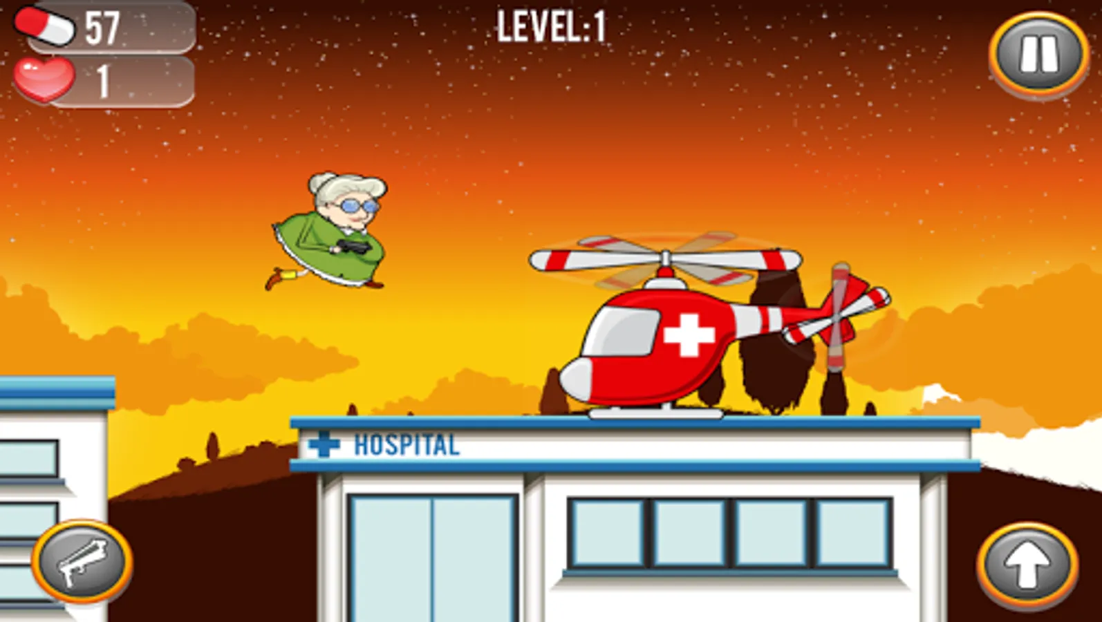 Help grandma run to escape and collect all the pills and medicine she need! This crazy granny run game is loaded with fun. Help this furious grandma by jumping to avoid the dangerous zombie nurses and zombie doctors to reach your destination and fly with the helicopter. Shoot all the zombies and run as fast as possible! Grandma racing has never been so funny! This free grandma games is loaded with ZOMBIES! But don't be scared, all you need to do is to shoot them with your big gun!!!