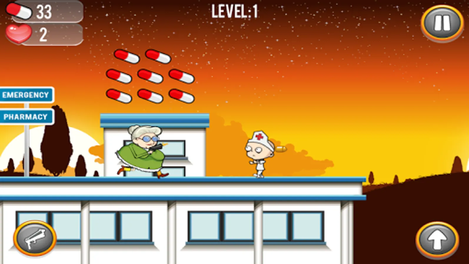 Running Granny Against Zombie is a free game that has many levels of fun. In this grandma running games, you will be pleased to collect all the pills but you need to be careful with the zombie nurses and zombie doctors. They are bad zombies, so you can either shoot them with your revolver or avoid them by jumping and running.