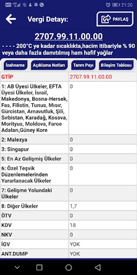 Tariff Based Customs Tax, VAT, SCT, İGV, EMY etc. tax rates