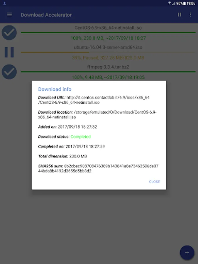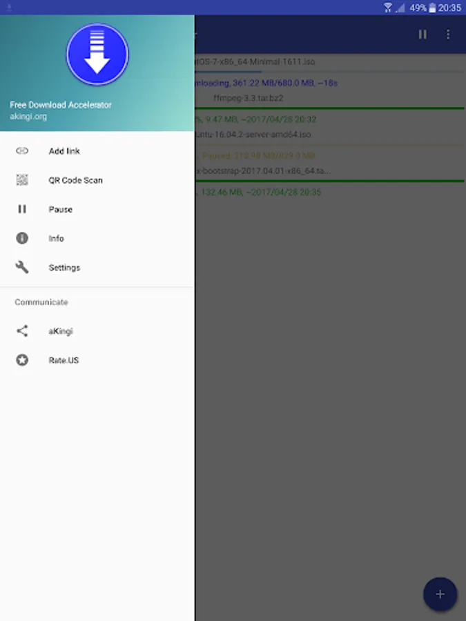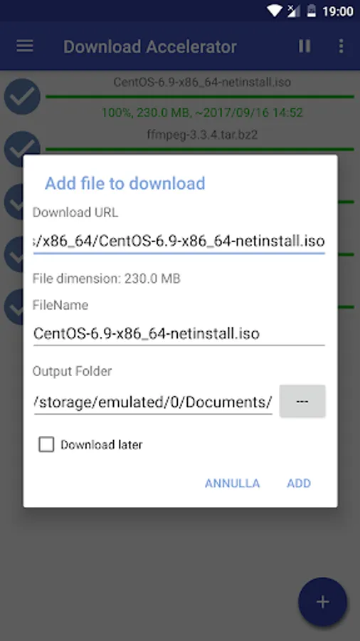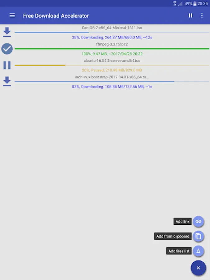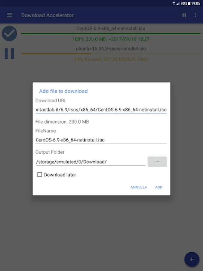 This app is designed to be used in a simple and immediate way, just paste a download URL (directly or from the clipboard, for example) and the accelerated download process, with up to 8 parallel connections, will immediately start. With only one app you can download, for example, videos, movies, music, ebooks, pictures, ZIP and other compressed archives, ISO images and any other files from Internet!