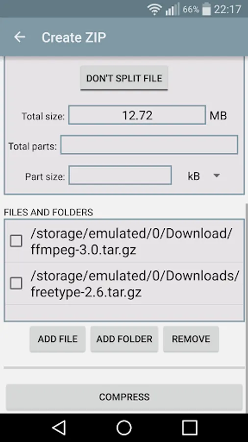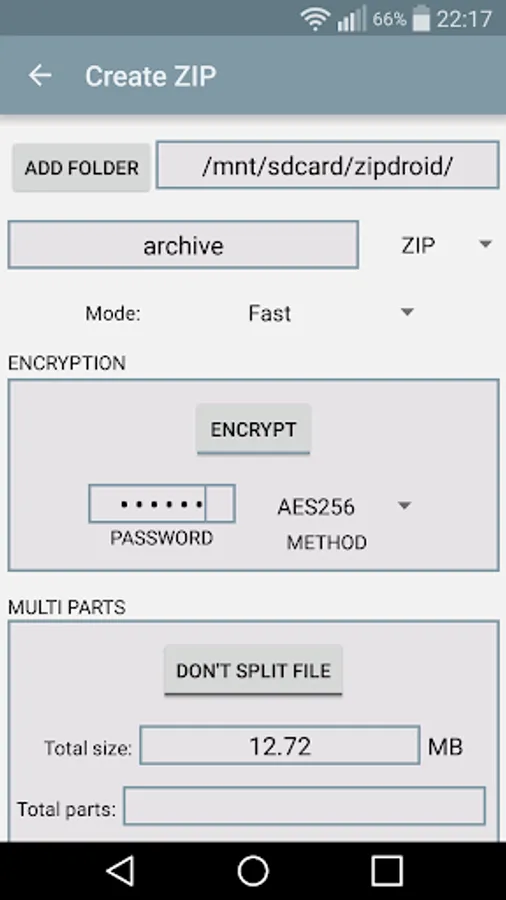 Ok, but what if you have to create a zip file instead? Then again ZipDroid is what you need! You can use the default options from the menu to compress files or whole folders in ZIP or 7z formats. If you want instead a better level of personalization for your compressed archive files, you can choose the CreateZip activity that will let you choose the output format, the compression level and method, set a password and even split the output file in different parts.