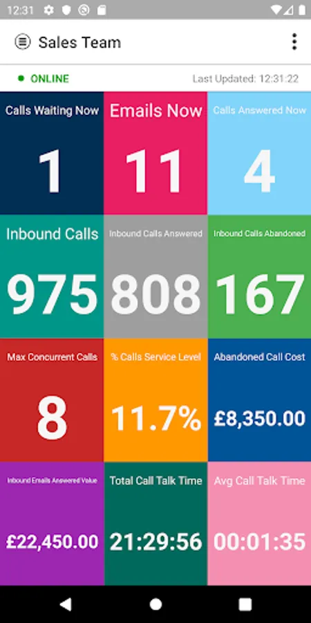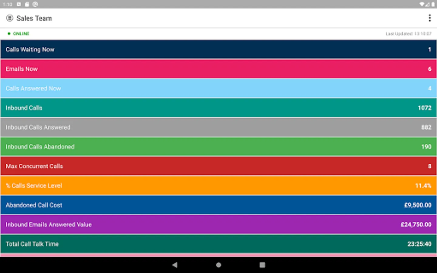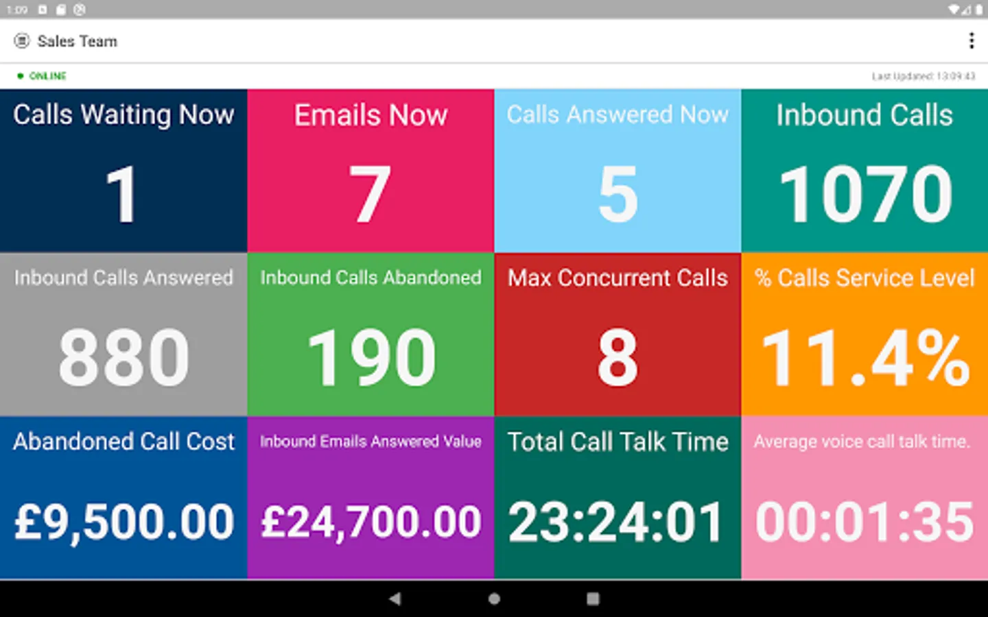 The wallboard, available with Akixi 1000, 2000 and 3000, displays real-time call and contact statistics on your mobile device and gives you a fantastic overview of your business’s performance. The wallboard offers a highly visual display with options to notify you with a sound notification or vibration alert when SLA alarms are triggered - perfect if you are in a meeting, on the road or working remotely. It can be fully customised via the desktop application to suit your company’s specific needs. You can swipe between different reports on your mobile device.