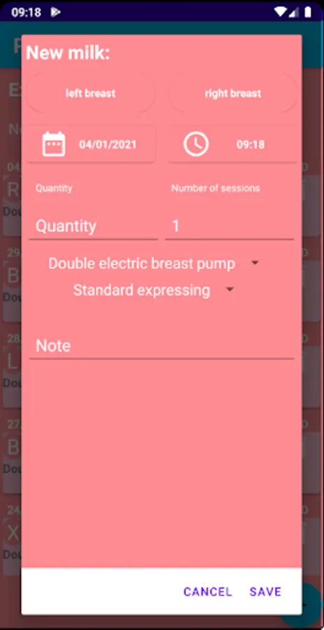 1. breast pump type (for each session separately),