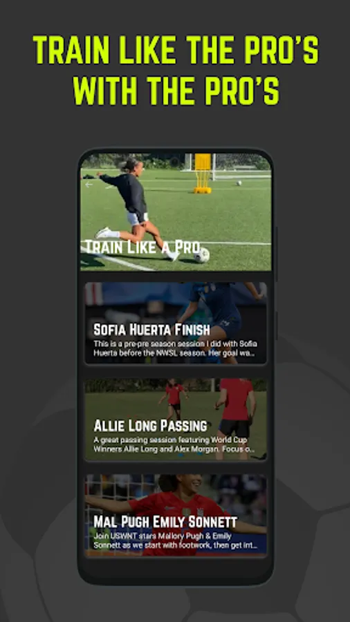 Our goal is for you to train like a pro, so you can become a pro! That’s why each soccer practice video session is broken down into a warm up, juggling, footwork and then drills for that sessions topic! Not to mention that the sessions feature professional players like Alex Morgan, Jordyn Listro, Rachel Daly, Kristie Mewis, Johnny Markey and more!