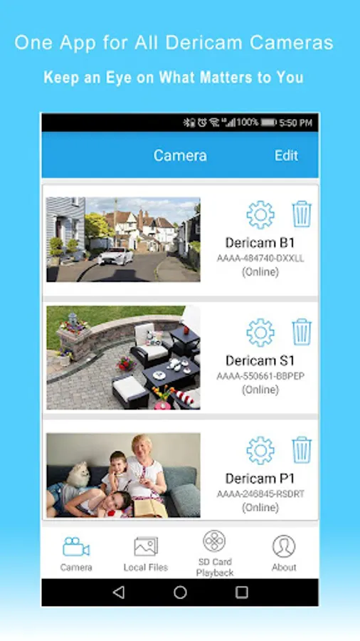 Dericam App can be used to preview, record, snapshot, playback recodings and pictures for Dericam cameras. It also can be used to configure settings and operate all features of Dericam camera.