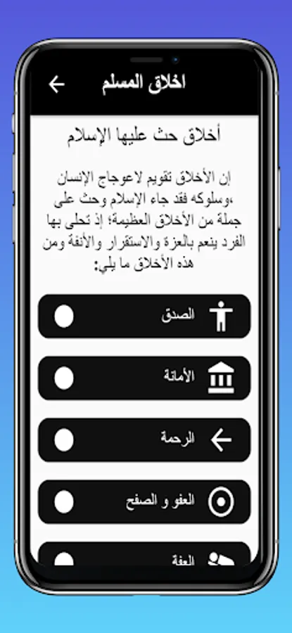 1. Educational content: The application provides articles and educational materials that deal with the concepts of Islamic morals and interpretations of values and moral principles contained in the Holy Qur’an and the Sunnah of the Prophet.