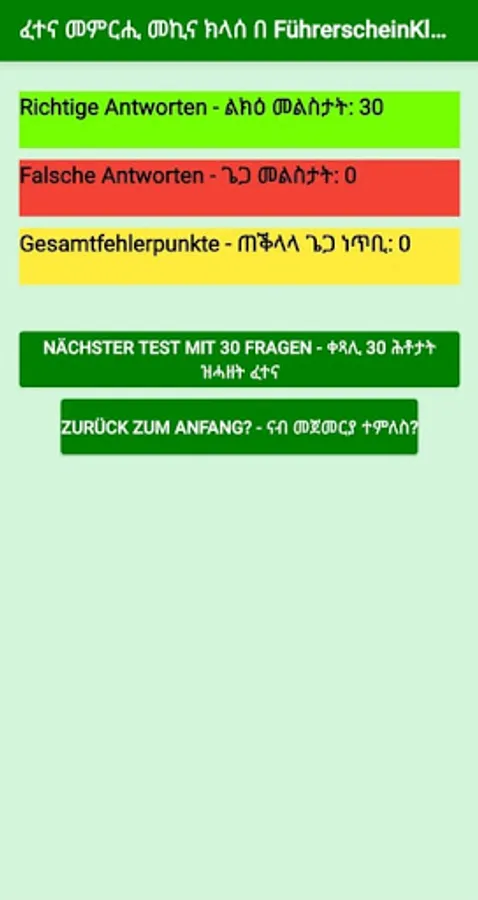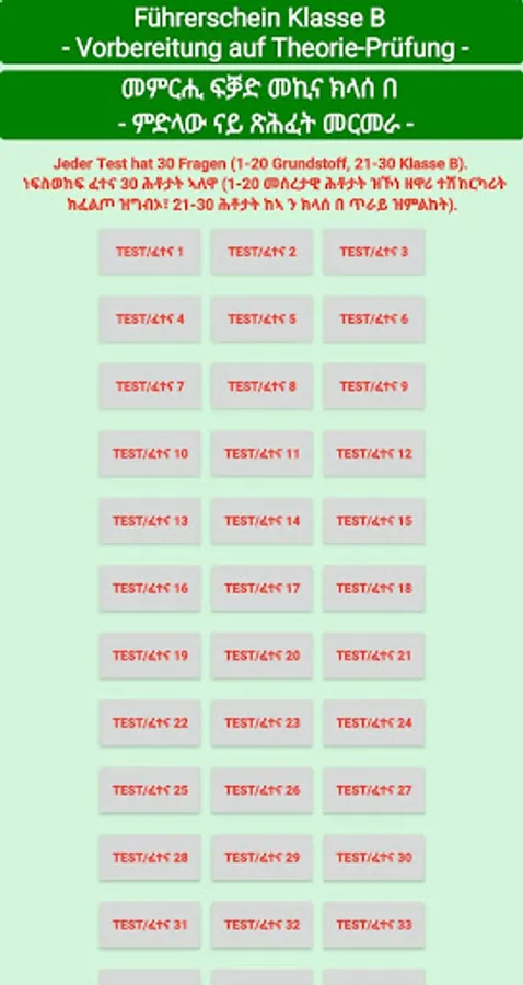 You can download this free German-Tigrinya driver's license class B app for Android. With this app you can prepare for the theoretical driving test on the go or at home on your Android smartphone. The app currently contains a total of 1080 questions (36 tests, each with 1-20 basic material and 21-30 class B questions) from the current official catalog of questions from TÜV and DEKRA for vehicle class B. You can also use the app to learn German at the same time .