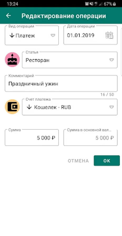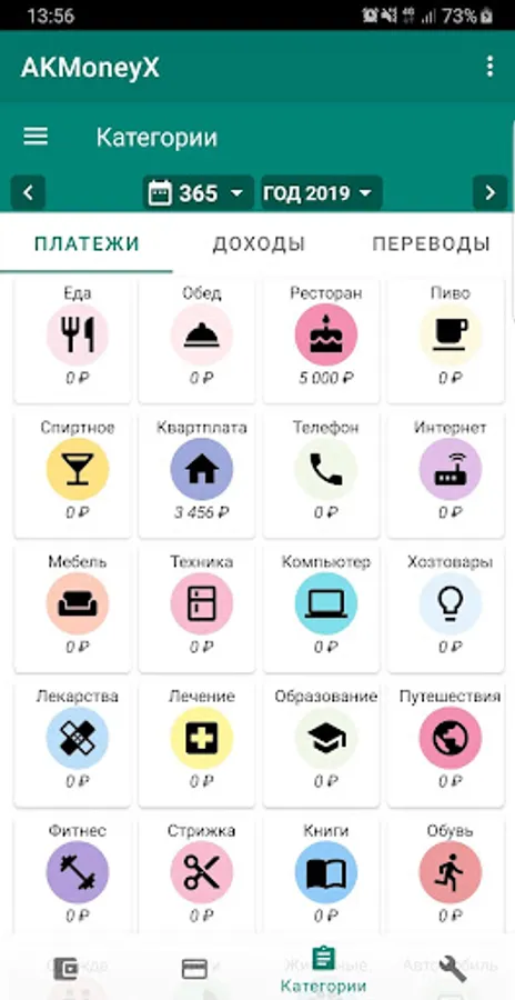 4. Create new categories of income and expenses (as well as transfers) or use a ready-made set. Choose a color and icon from hundreds of possible.