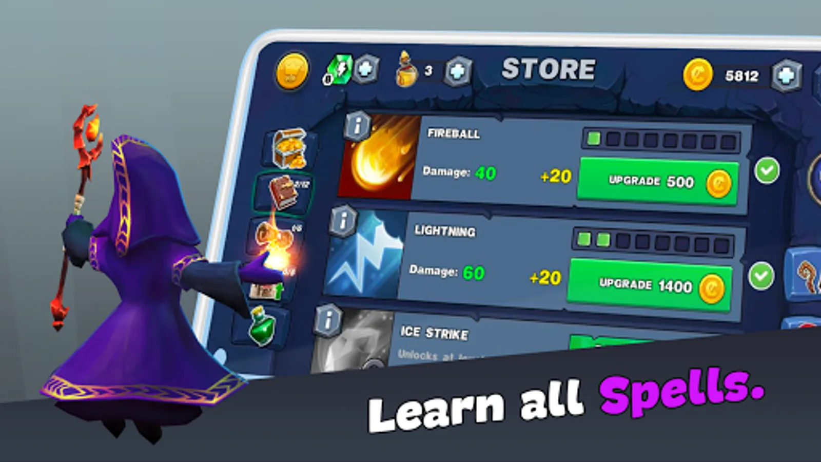 You are a powerful mage which defends its own castle from the waves of monsters. It will not be easy! You will need to use your tactical skills and the impressive quantity of magic skills and magic scrolls with different effects to kill all your enemies. Using the spell upgrade system, you will raise the might of your spells, to kill more powerful monsters.