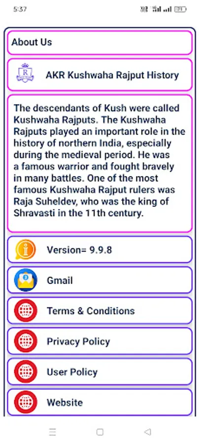 The AKR Kushwaha Rajput History App is a complete reference guide to the most popular Rajput clans. This app provides a brief history of the Rajput clans and details their genealogical lineage, origin, and the royal lineages.