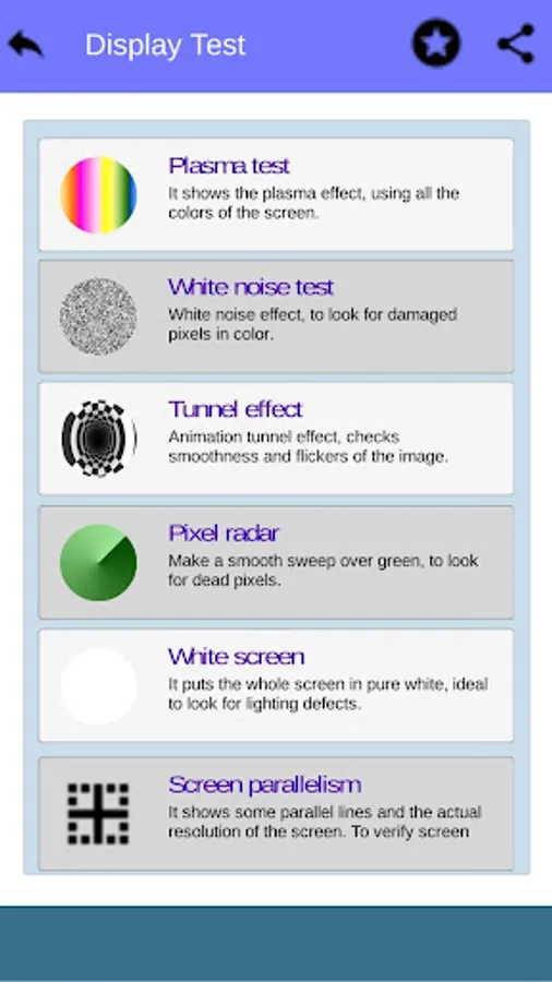 You can also check the actual resolution of the display and the parallelism of your screen. It also contains animations to check the smoothness and speed of your device and the quality of the screen.
