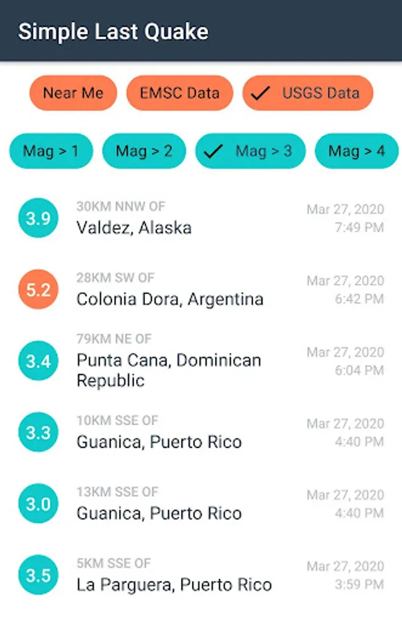 Shows the last Earthquakes from American and Europe data. Nothing fancy here just list of last 100 earthquakes from live data on USGS and EMCS server.