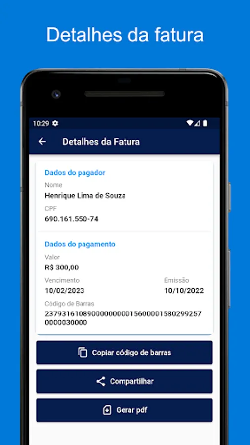 Access your invoices, invoices and plans, copy the barcode, download or share the slip, release it by trust and contact support, all this and much more via the app!