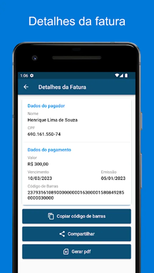 Access your invoices, invoices and plans, copy the barcode, download or share the slip, release it by trust and contact support, all this and much more via the app!