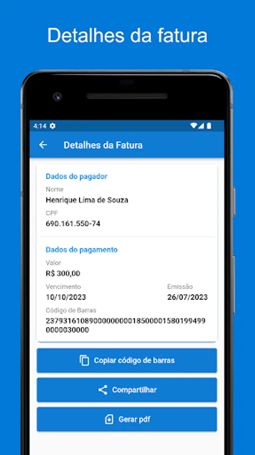 Access your invoices and plans, copy the barcode, download or share the bill, release it in confidence and contact support, all this and much more via the app!