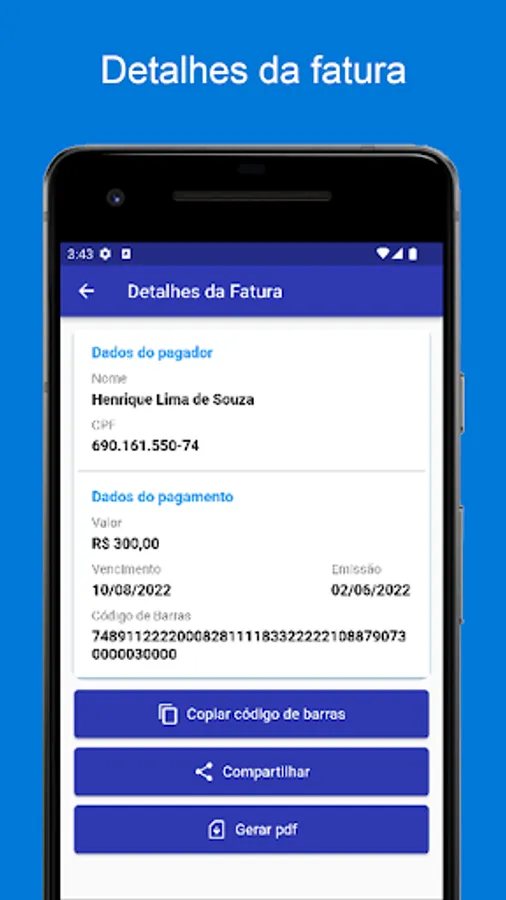 Access your invoices, invoices and plans, copy the barcode, download or share the boleto, release by trust and contact support, all this and more via the app!