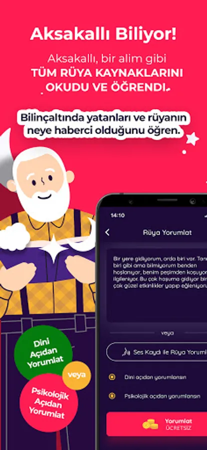 Aksakallı is an advanced artificial intelligence supported Turkish dream interpretation application. In addition to artificial intelligence, you can have it interpreted by real interpreters who are experts in dream interpretation.