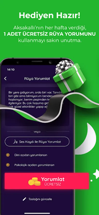 Aksakallı interprets all the symbols and objects in your dream with what he learned from religious scholars. He looks at the overall dream and gives you various news.