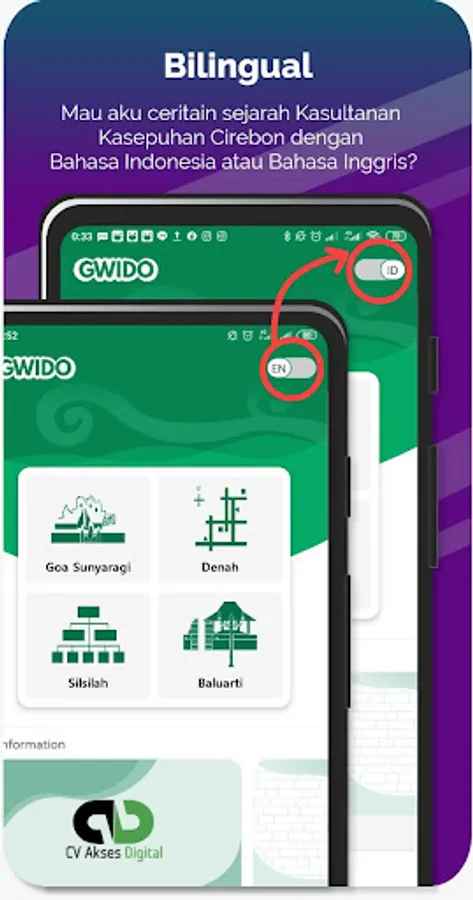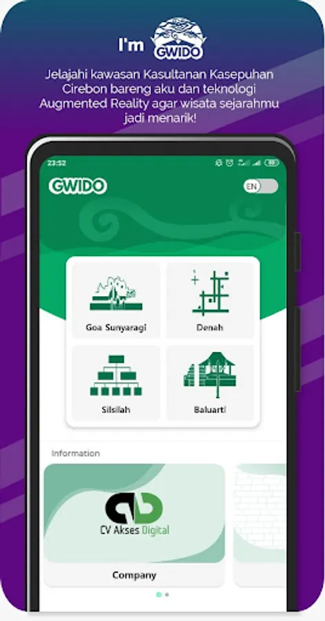 GWIDO application is a digital innovation for traveling in Kasepuhan Cirebon Sultanate with Augmented Reality technology. Only by pointing the smartphone at a particular object, then feel the experience of exploring different historical attractions and more interactive.