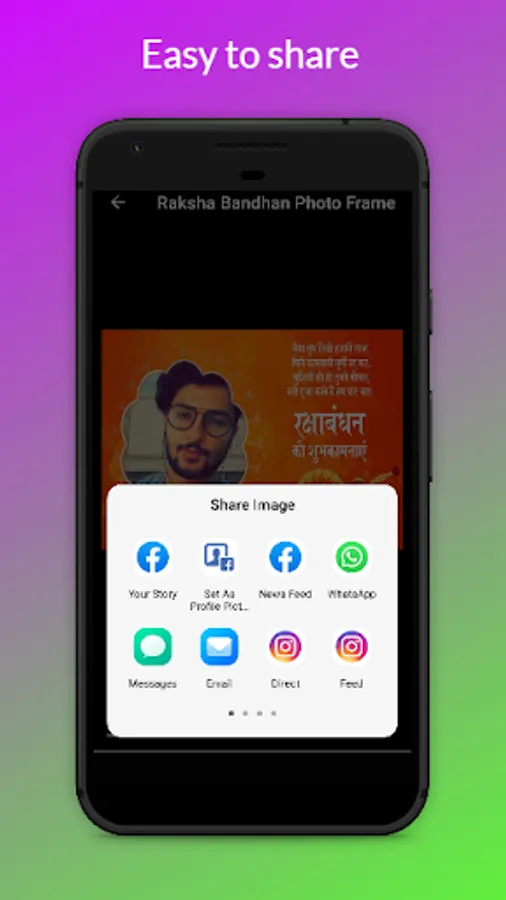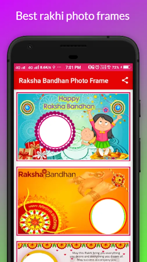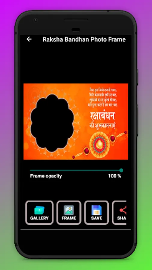 All Frames contains some beautiful message for your brothers and sisters. Raksha Bandhan Photo Frames app has a very user-friendly interface through which you can make photo frames in a minute without any hassle. Save them and send them as messages or posts on any social media platform.