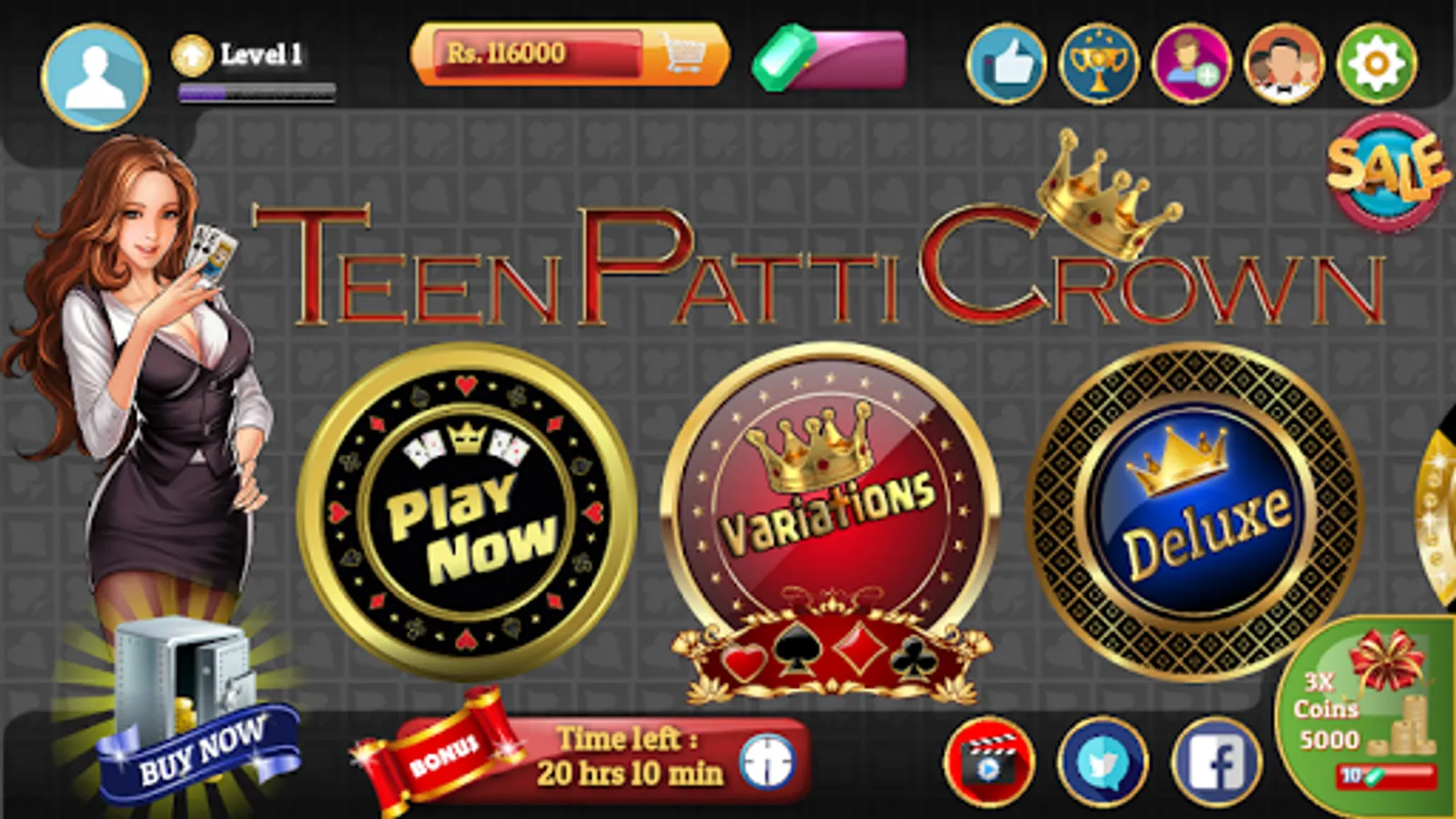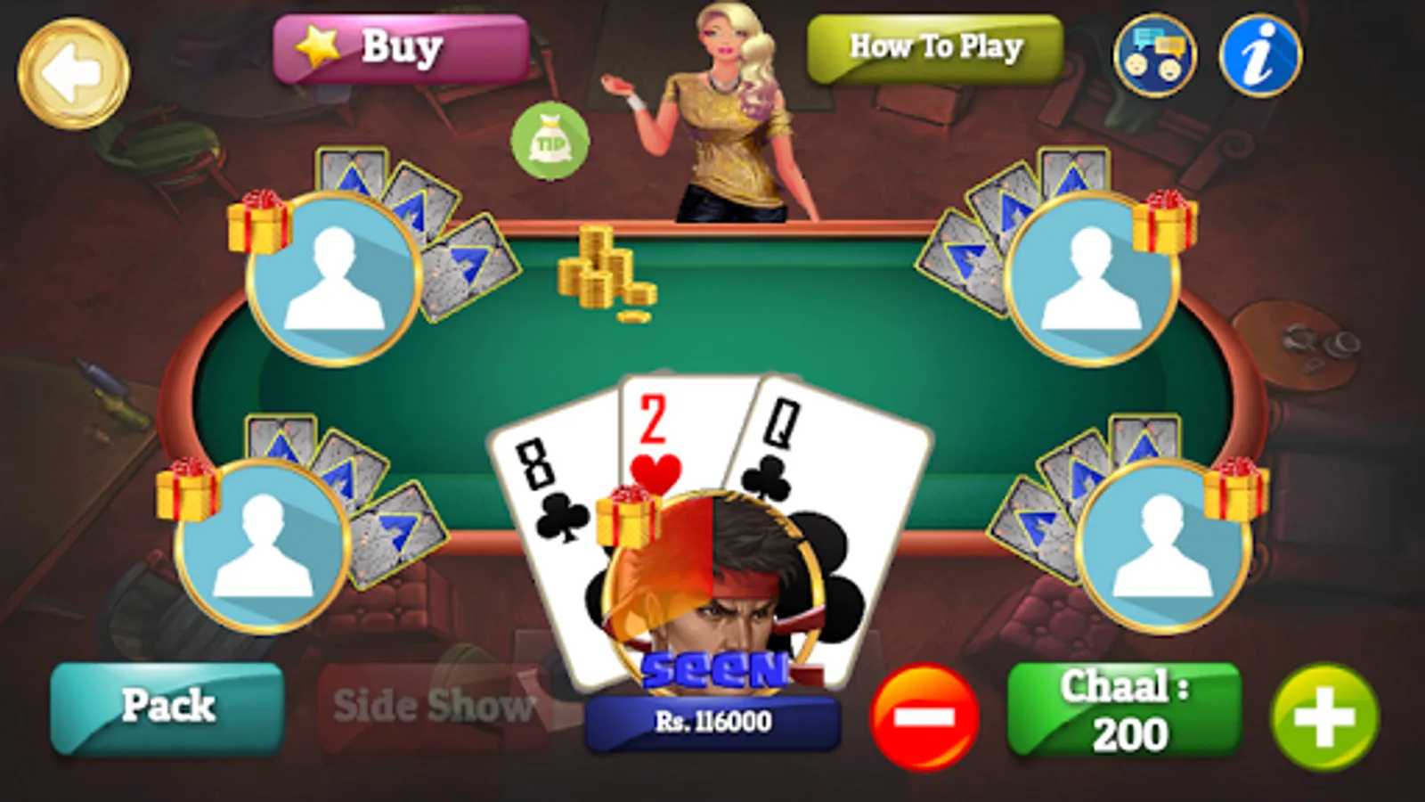 Teen patti (तीन पत्ती, meaning 'three cards' in English) (also known as flash or flush) is a gambling card game that originated in the Indian Subcontinent. The game, which is actually a simplified version of poker, is popular throughout South Asia. Play it offline for your entertainment. Online feature coming soon to connect and play with your family and friends.