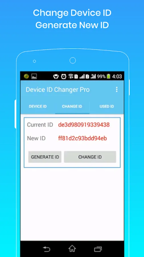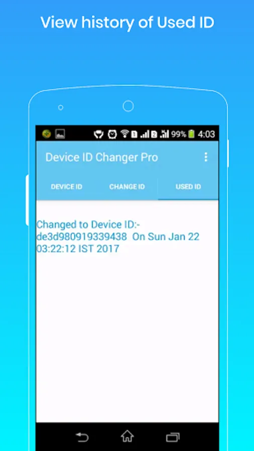 * You can see the list of all device id with date which is set by using this application. You can save used id list to your internal storage.