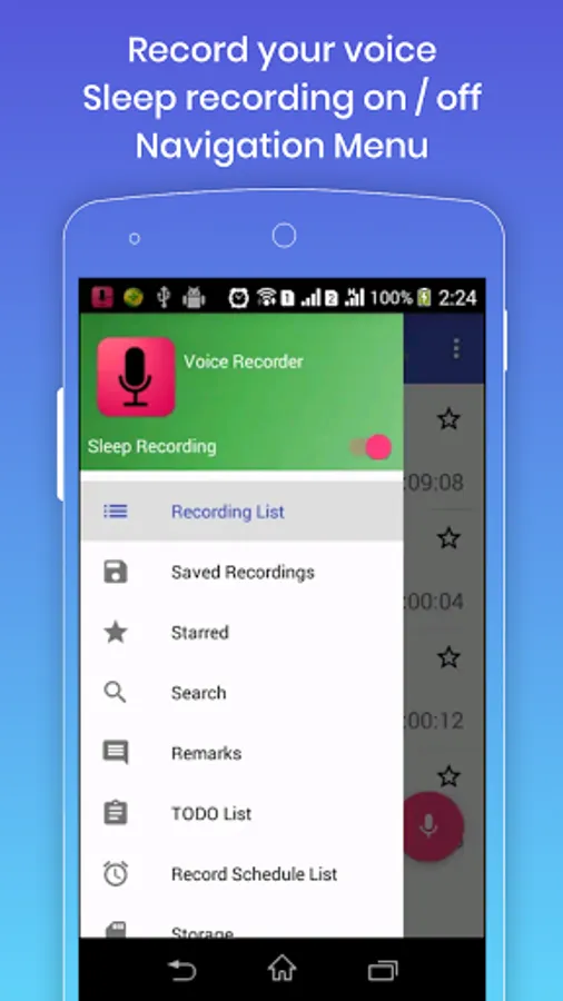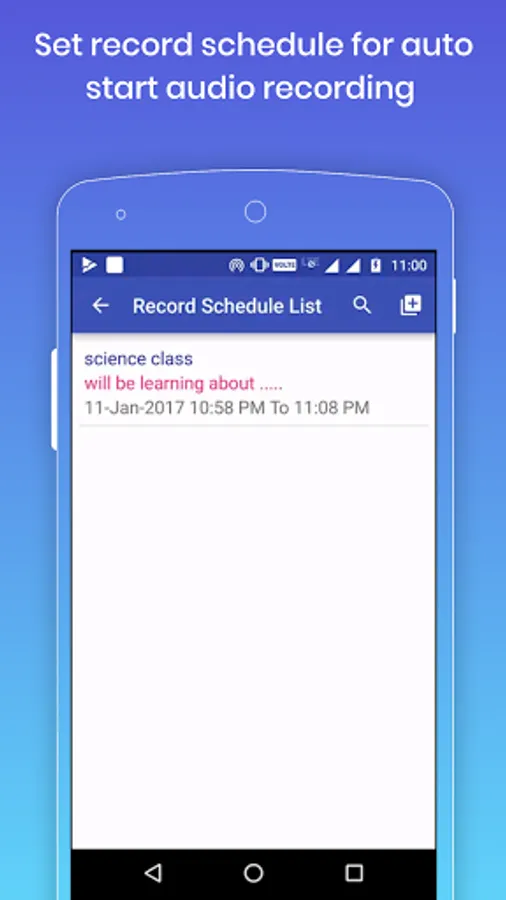 "Schedule voice recorder" or "Voice Recorder": Now Record your voice ,audio ,sleep and FM radio . You are in hurry and does not listen your opponent carefully. Don't worry, Record all your voice ,audio and FM radio easily and can listen later. you can can share call recordings with anyone. You can schedule your voice record so it will be start recording voice automatically at schedule time.