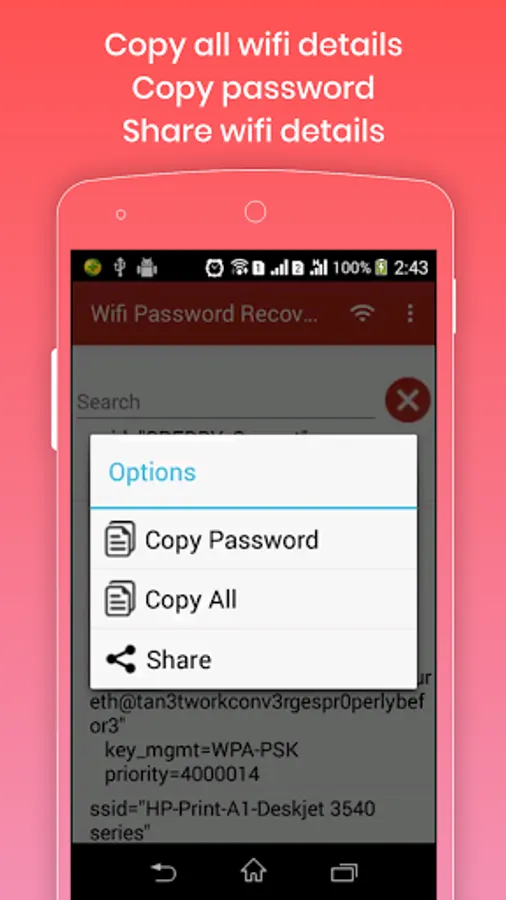 Wifi password recovery : Your friends wanted to connect with your wifi or you wanted to connect new device with wifi network but you don't remember your password. Don't worry. Now you can easily view your password by using this application.