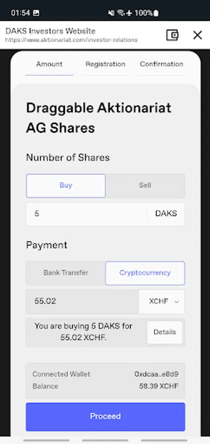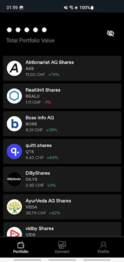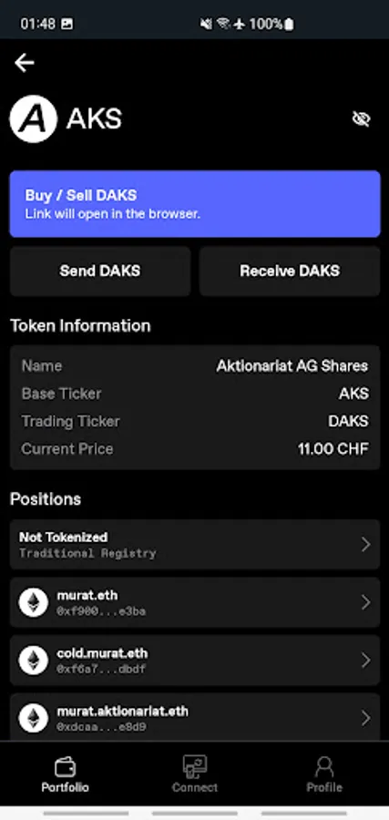 The Aktionariat Portfolio app lets you see and manage your tokenized share portfolio.