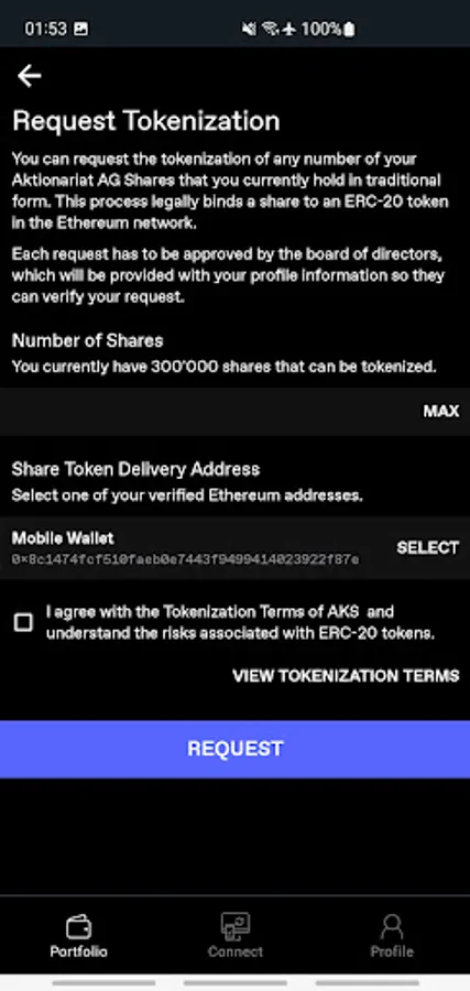 Aktionariat AG also manages the company shareholder registry for its client companies. If you are a shareholder who only holds traditional shares in such a company, you can request tokenization of your shares directly from inside the app. The app automatically fulfills your legal duty to register yourself as a shareholder for all the share tokens you acquire.