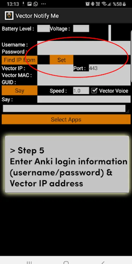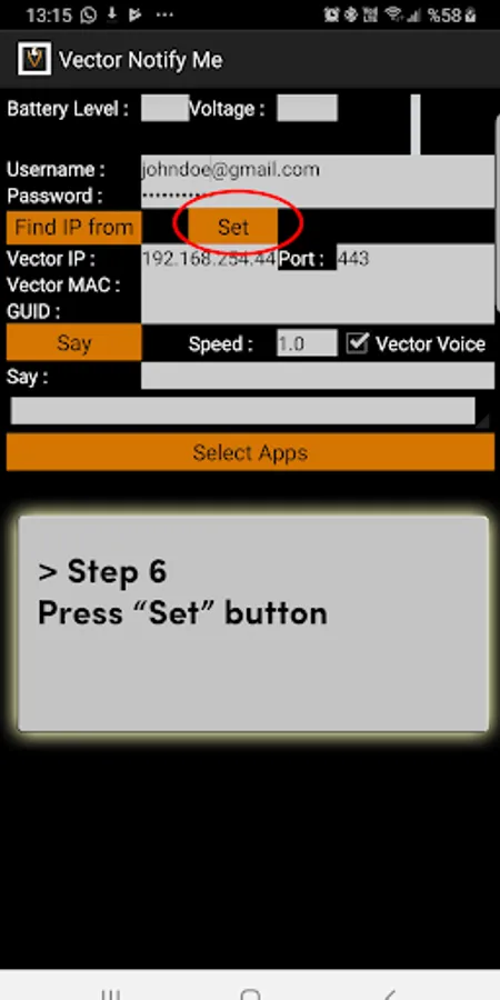 You just need your Anki login credentials (username and password), name , serial number and IP address of your robot. When all these 5 are entered correctly (and other possible configuration options) , you have to press the "set" button.