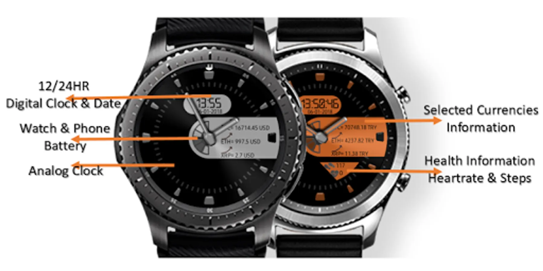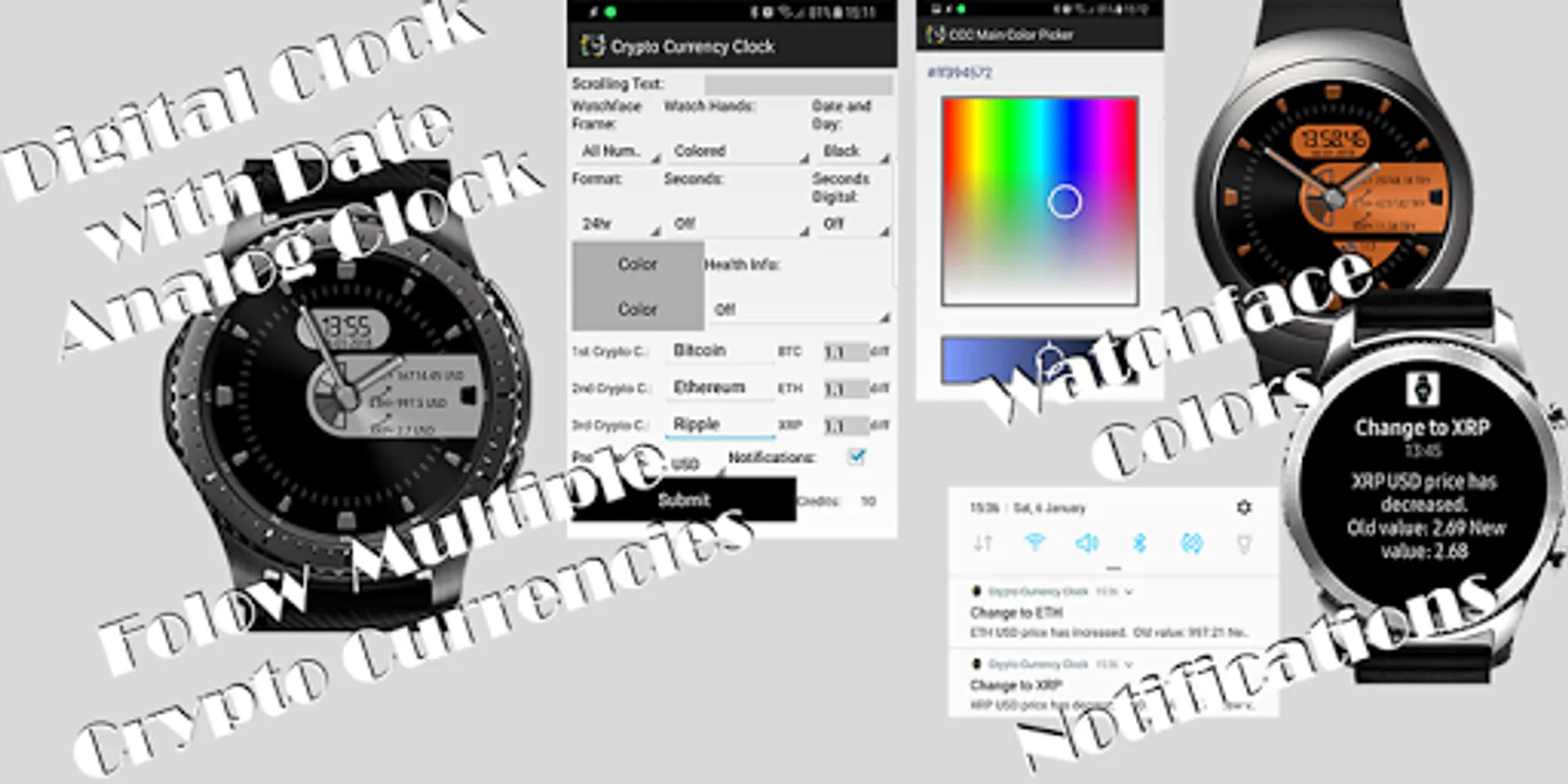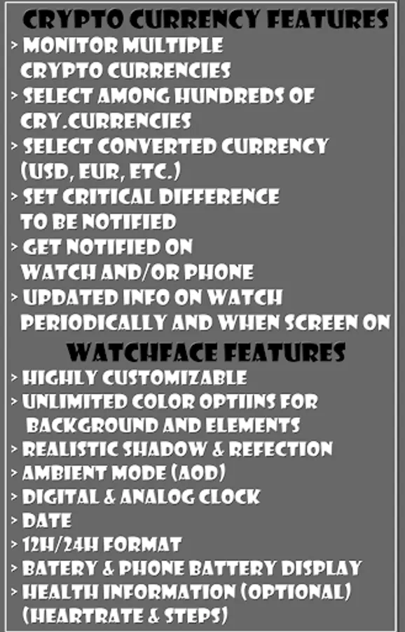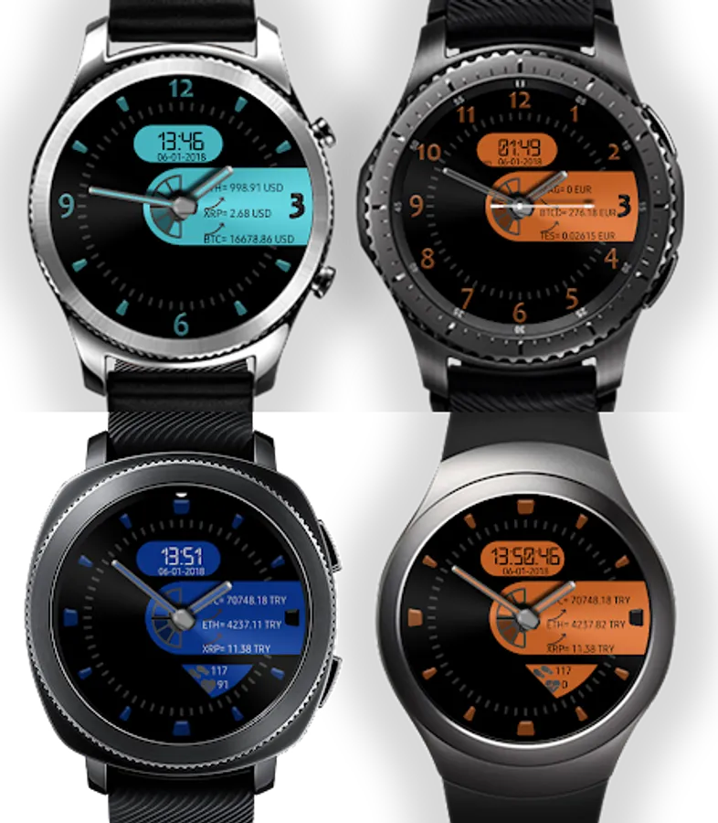 The watchface/app is a uniq design watchface with several features from original Defilmirz watchface. In addition to the watchface functionality, Crypto Currency Clock has uniq features for following selected crypto currencies easily from your Gear S2/S3 watch.
